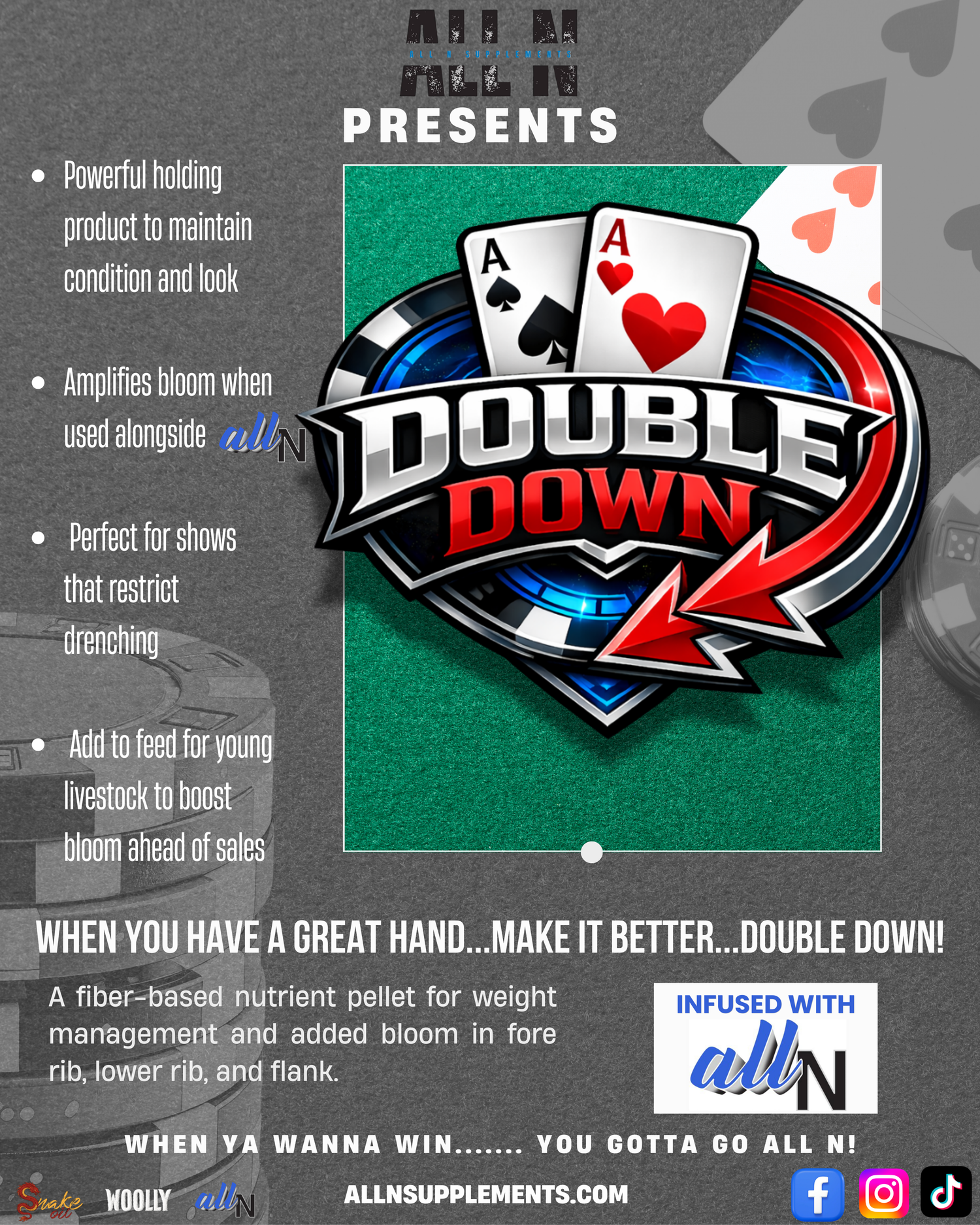 All natural hydration and muscle enhancement supplement. For use on all species of livestock. To add a bloom for show day use All N as recommended to achieve the best results possible. Follow instructions for dosing on the label.